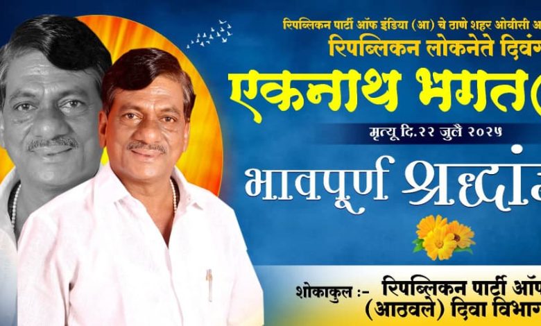 रिपब्लिकन पक्षाचे ओबीसी आघाडी अध्यक्ष ठाणे शहर दिवंगत एकनाथ भगत यांचे निधन झाले व आंबेडकरी चळवळीत काम करणाऱ्या प्रत्येक कार्यकर्त्याला एक धक्का बसला.दिव्यातील आगरी समाजाचे भूमिपुत्र असलेले एकनाथ भगत यांनी आपले संपूर्ण आयुष्य आंबेडकरी चळवळीला समर्पित केले. रिपब्लिकन पार्टी ऑफ इंडिया (आ) केंद्रीय सामाजिक न्याय राज्यमंत्री रामदासजी आठवले साहेब यांचे नेतृत्वाखाली दिव्यात रिपब्लिकन पक्ष वाढवला.आयुष्याचे शेवट पर्यंत रिपब्लिकन पक्षाची एकनिष्ठ राहिले.दिव्यातील सामाजिक सलोखा राखण्यासाठी एकनाथ भगत साहेब यांनी आजवर महत्वाची भूमिका बजावली. दिव्यातील गोरगरीबांचा आवाज म्हणजे एकनाथ भगत, दिव्यातील बहुजन समाजाचा नेता म्हणजे एकनाथ भगत अशी ओळख.